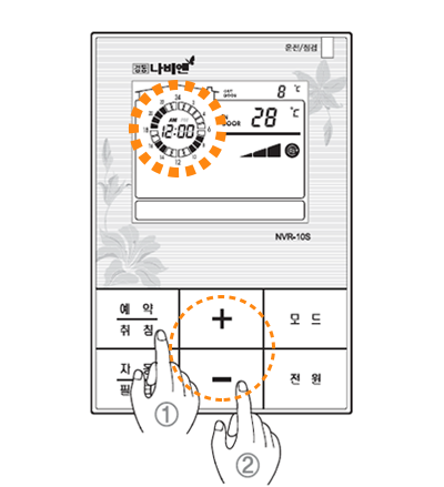 1. +/- 버튼을 눌러 예약하고 싶은 시간으로 이동합니다.- 모드 버튼을 눌러 예약 운전 시간을 설정합니다.