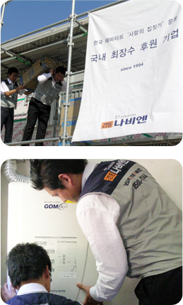경동나비엔은 지난 2000년 전라도와 경상도의 접견 지역인 섬진강변에 ‘평화를 여는 마을’ 건축 사업을 지원하며 영호남 지역 화합을 추진했고, 2001년에는 지미 카터 전(前) 미 대통령이 참여하는 ‘2001 지미 카터 특별 건축 사랑의 집짓기 프로젝트’에 보일러 전량을 기증하기도 했다. 경기도 평택의 장애우 생활 시설인 ‘평안 밀알 선교단’과 오갈 데 없는 무의탁 노인 및 장애우들이 거주하는 경북 문경의 ‘효도마을’ 등에도 경동나비엔의 보일러가 설치된 바 있다. 뿐만 아니라 2006년 6월부터는 사랑의 집짓기와는 별도로 ‘해비타트 사랑의 집고치기’ 프로그램에도 참여해 열악한 주거 환경 개선에 도움을 주고 있다.