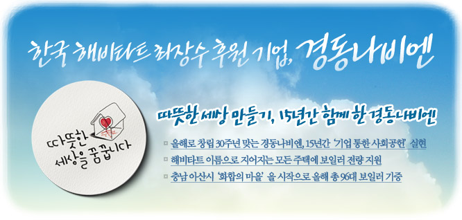 쾌적한 생활환경을 창조하는 기업 경동나비엔(www.kbnavien.co.kr 대표 김철병)이 한국 해비타트 ‘사랑의 집짓기’ 운동에 15년간 후원해오고 있다. 이는 국내 사기업 중 최장 기간 후원이며 기업 창설 30년 중 반절에 해당하는 기간이다. 해비타트 운동은 무주택 서민들에게 무료로 집을 지어주는 운동으로 경동나비엔은 1994년 국내 최초로 의정부에 지은 사랑의 집에 가정용 보일러를 지원하면서 인연을 맺었다.