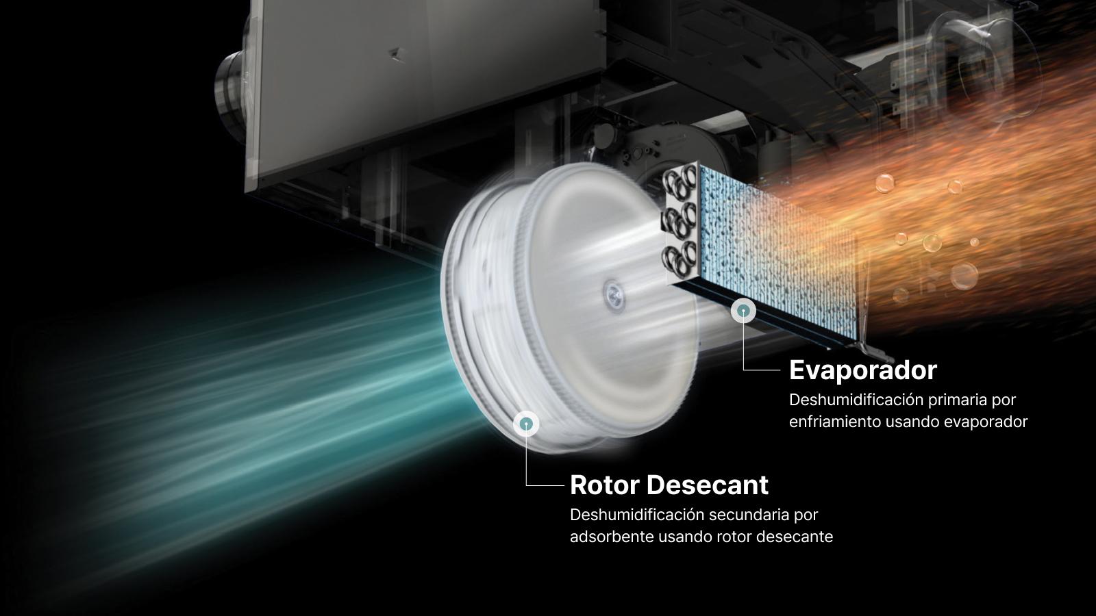 Esta soluciรณn de deshumidificaciรณn dual combina la deshumidificaciรณn por adsorbente y por enfriamiento, controlando la humedad sin alterar la temperatura ambiente para ofrecer un aire consistentemente limpio.