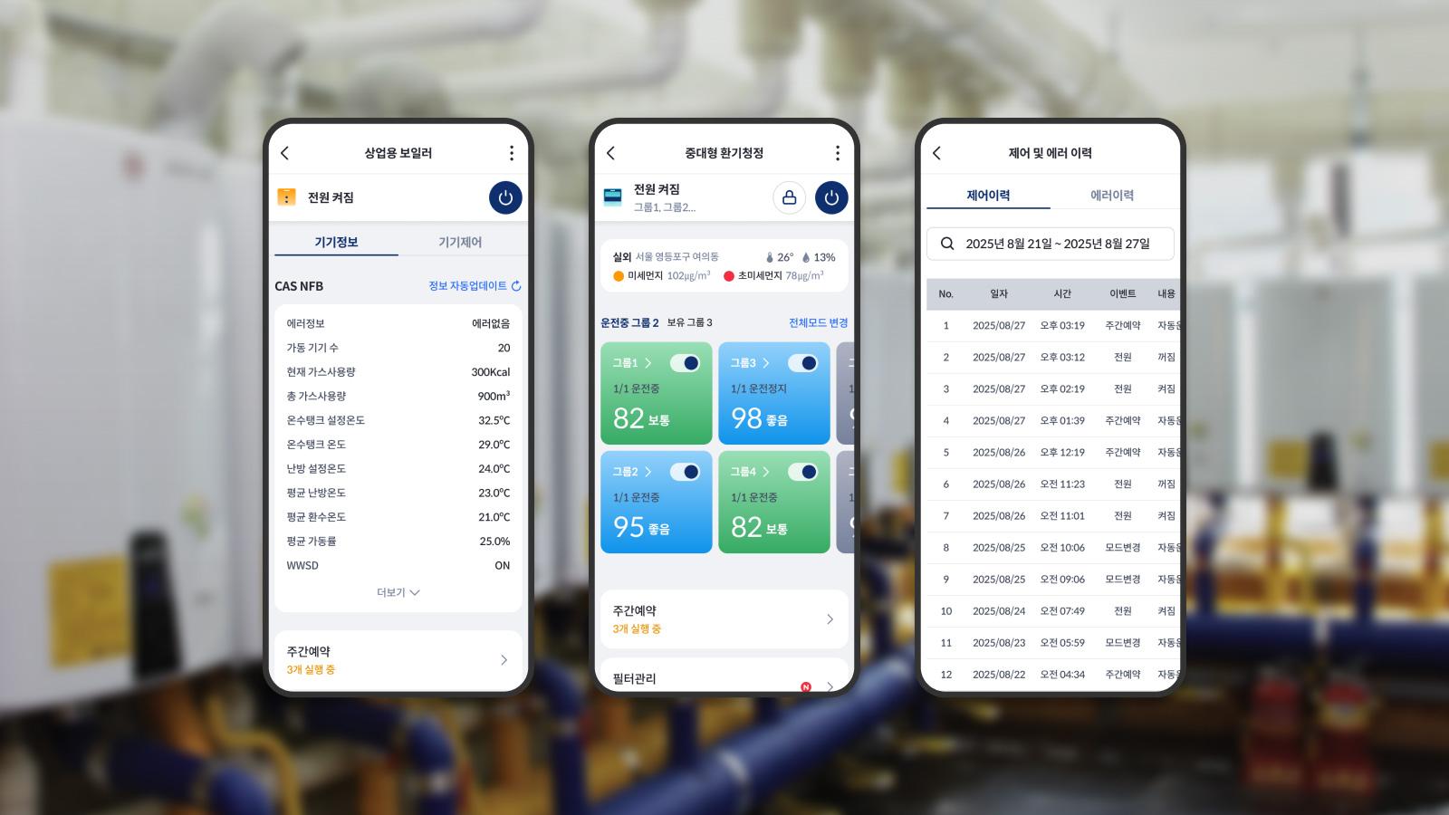 상업용 보일러와 중대형 환기청정기를 모니터링하고 제어할 수 있습니다.