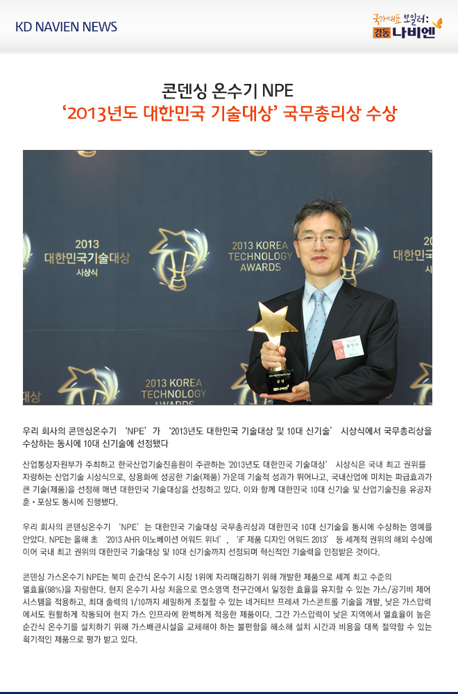 콘덴싱 온수기 NPE ‘2013년도 대한민국 기술대상’ 국무총리상 수상