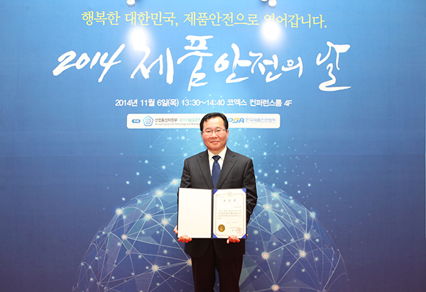 우리 회사가 지난 11월 6일 코엑스 그랜드컨퍼런스룸에서 진행된 ‘2014 제품안전의 날’ 행사에서 산업통상자원부 장관 표창을 수상했다.