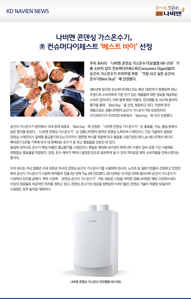 나비엔 콘덴싱 가스온수기, 美 컨슈머다이제스트 ‘베스트 바이’ 선정