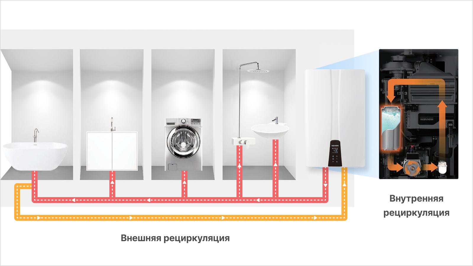 Запатентованная система ComfortFlow® от Navien первая система, в которой безбаковый водонагреватель объединил в себе буферную емкость, рециркуляционный насос и точные регуляторы. Это решает проблему эффекта «сэндвича с холодной водой» и проблемы минимального расхода воды, характерные для других безбаковых водонагревателей.